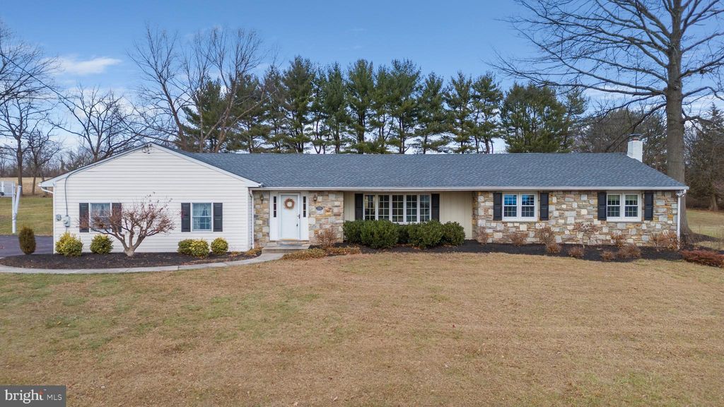 Beautiful stone front ranch home with over 4,000 square feet of living space on 1.4 acres backing to open farmland. Newly remodeled kitchen (2023) with custom white cabinets, stylish quartz countertop and backsplash, newer appliances including an induction range, luxury vinyl plank flooring, under cabinet lighting and walk-in pantry that could serve as a butler's pantry. The kitchen is open to a large breakfast area with the same plank flooring, vaulted wood plank ceiling, two skylights, track lighting, a wall of windows and glass door to a paver patio, all overlooking a peaceful, serene and very private rear yard with pretty garden beds. The adjacent great room boasts a vaulted shiplap ceiling, multiple fixed windows and open steps to a finished basement. The formal living room offers a bow window and opens to the adjacent dining room with wall scones, chair rail and French glass doors to the breakfast area. The family room at the back of the home has another bow window and a raised hearth fireplace with a Minolta gas insert and brick surround. The owner's bedroom has a walk-in closet with organizers, a 2nd closet and a nicely updated full bath with walk-in shower with tile surround and seamless glass doors, dual vanity with quartz counters and built-in cherry cabinets. The other two bedrooms in the original wing of the home are serviced by an updated hall bath with laundry. The 4th bedroom is adjacent to the family room and utilizes a full bath off the breakfast area. The finished basement area offers two rooms each with tile flooring and walk-in closets. The original basement area is unfinished and offers tremendous storage and potential uses. Oversized two-car garage (28x24) and shed offer additional storage. *** New Yorker boiler with 6 zones *** 2 Carrier Central AC units (2022) *** New Roof (2021) *** Public Sewer (connected in 2021) *** New Well tank (2023) *** Clean neutral decor, great natural light, and a ton of room to spread out. Meticulous attention has been given to maintenance, updates and energy efficiency. Great location on a quiet street in Towamencin Township with easy access to schools, shopping, commuter routes, parks and recreation.
