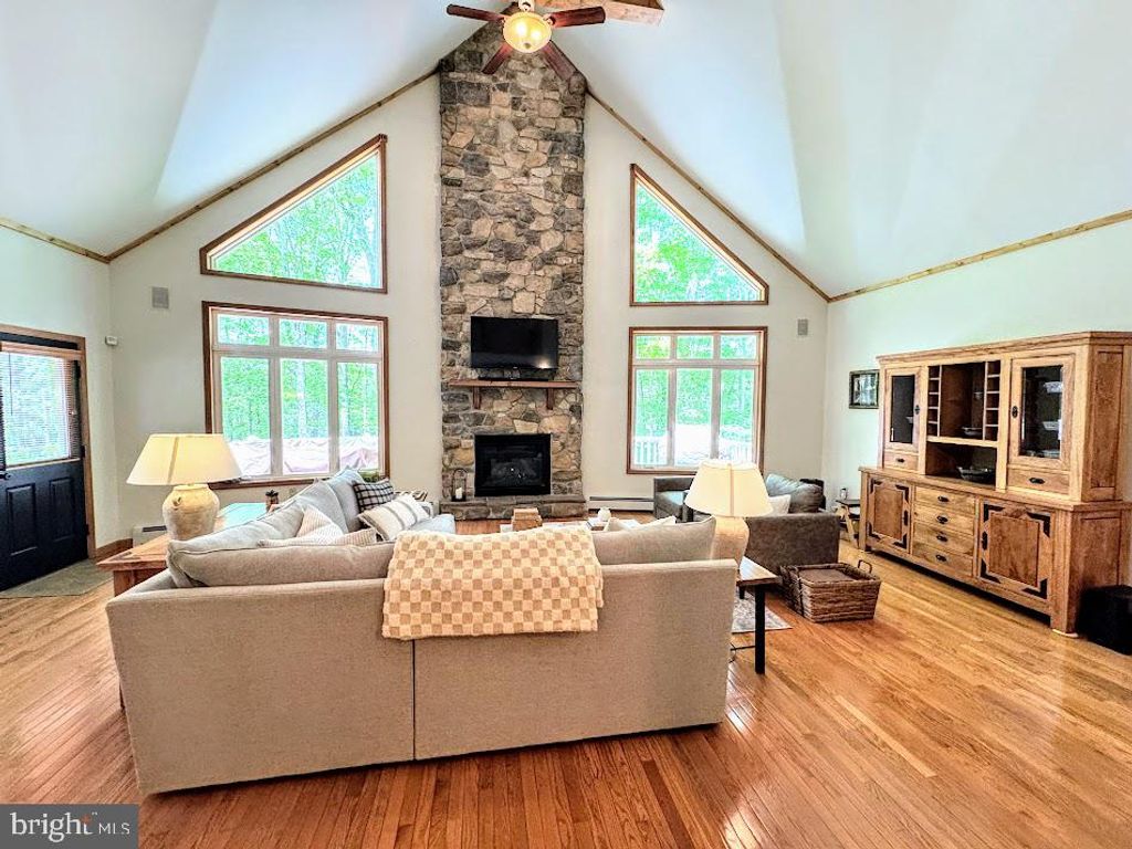 NESTLED ON A PRIVATE, WOODED LOT IN THE 4 SEASON,. PRIVATE , GATED COMMUNITY OF EAGLE ROCK RESORT NESTLED IN THE BLUE MOUNTAINS OF PA! Featuring an open concept living room , dining room and kitchen, with soaring ceilings and a coz stone, floor to ceiling fireplace. This home is ideal for relaxing or entertaining. Enjoy the screened -in porch and wraparound deck -perfect spots to unwind and take in the peaceful surroundings. The lower level family room includes a wet bar and additional living space, making it great for gatherings or guests. Step outside to a private backyard with a trail leading to a stream and hiking trails, creating the ultimate mountain retreat. With abundant outdoor living areas and serene views, this home is a true escape into nature. Eagle Rock has many amenities to enjoy including; 2 golf courses, indoor/outdoor pools, lake , beach, tennis, pickle ball, bocci ball and corn hole courts, spa, gym, activity center, equestrian center , dog parks and so much more!